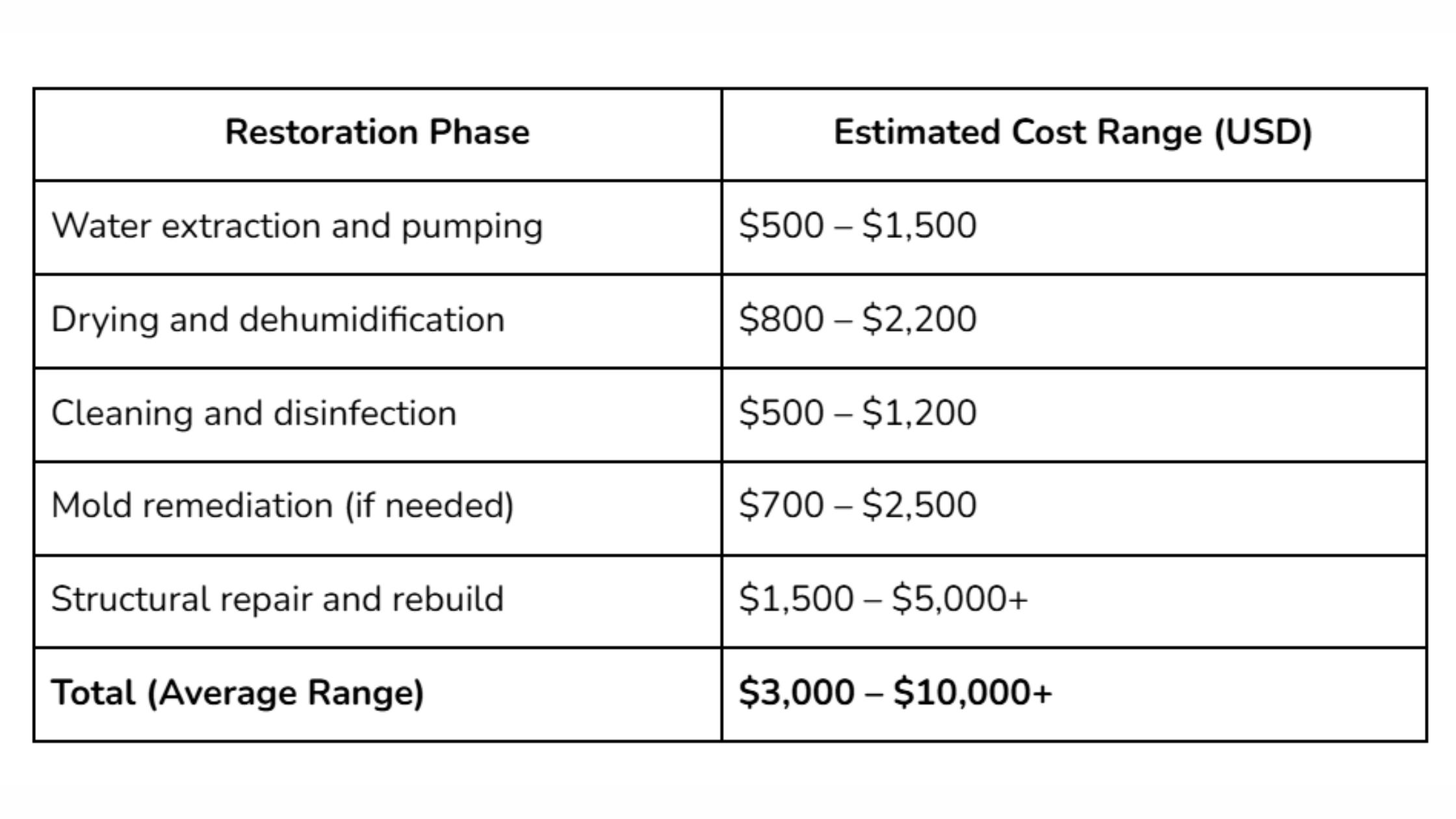 Actual totals depend on flood depth, material quality, and speed of professional response. Early intervention keeps costs on the lower end of the spectrum.